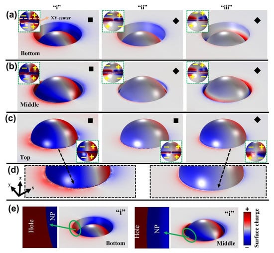 (a–c) 3DSCDM profiles extracted from integrated nanostructures from their respective resonance wavelength positions marked from “i” to “iii”. (d) Magnified surface charge density distributions near NP–hole interface for an integrated nanostructure with a NP positioned on the top (for resonance wavelength positions “i” and “iii”). (e) Magnified surface charge density distributions near NP-hole interface for integrated nanostructures when NP is positioned at bottom and middle (resonance wavelength position “i”).