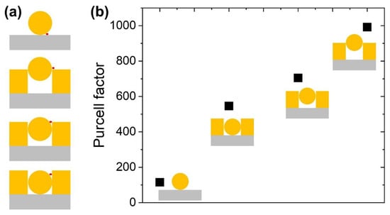 To further strengthen the importance of the integrated nanostructure, we calculated the Purcell factor in understanding the local intensity enhancement. We had extracted the Purcell factor from integrated nanostructures and compared it with individual NP structure (Figure 5). For this purpose, we had placed the emitter close to the NP’s EFmax area as schematically shown in Figure 5a [42,43]. The Purcell enhancement is ~10 times better with NP positioned at the top (integrated nanostructure) as compared to the individual nanostructure. Combination of higher Purcell factor and local field enhancement properties from the integrated nanostructure (with NP on the top) will benefit surface-enhanced applications, cavity nanostructures, sensing, and so on [44].