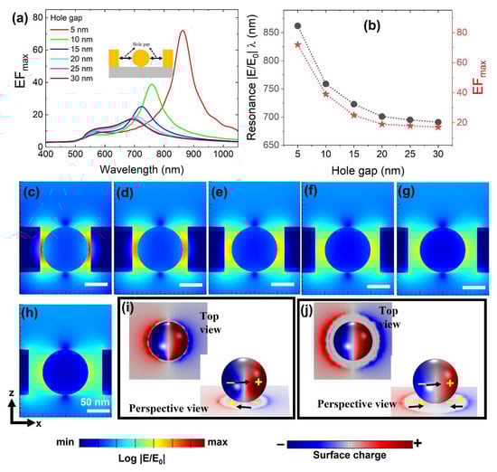 We also considered a possible situation where hole width could be larger than NP diameter (h > d) based upon fabrication errors. To analyze the integrated nanostructure’s geometrical tolerance, a geometrical parameter “hole gap” (Figure 6) was introduced and its influence towards gap-mode based near-field enhancement was evaluated. For this study, a NP positioned at the bottom will be a practical possibility. The hole gap is varied from 5 nm to 30 nm in 5 nm steps, and its influence over broadband near field spectra is shown in Figure 5a. Extracted EFmax values from its respective resonance wavelength positions as a function of “hole gap” sizes are plotted in Figure 6b. A decrease in near-field strength is seen when the “hole gap” size increases. The resonance wavelength position of gap mode blue-shifted from 862 nm to 691 nm (171 nm span) with a decrease in EFmax from 72 to 17 when the hole-gap size varied from 5 nm to 30 nm. The corresponding cross-sectional XZ electric field profiles taken at their resonance wavelength positions were displayed in Figure 6c–h (5 nm to 30 nm in order). Gap mode properties are observed till the hole-gap size of ~20 nm. Once the plasmonic gap mode became negligibly small or severely deteriorated, EFmax resonance wavelength shift and intensity became ~ constant (hole-gap size > 20 nm). To distinguish these characteristics clearly, we extracted 3DSCDM profiles for hole-gap sizes of 5 nm (Figure 6i) and 25 nm (Figure 6i). Even though the surface charge interactions look identical on the NP surface in both cases, a difference is clearly seen on the substrate surface. A dipole mode-like interaction is observed when the hole gap size is 5 nm (Figure 6i). For a hole-gap size of 25 nm, a quadrupole mode appeared (Figure 6j). This explains the why at a 5 nm hole-gap size we can extract better EFmax, as compared to a 25 nm hole-gap size. A geometrical tolerance of ~20 nm is significantly vital with recent advances in fabrication methods.