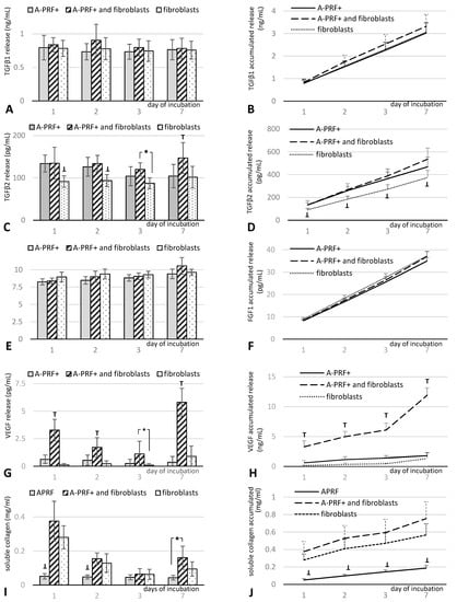 The quantification of protein released from A-PRF+ alone, A-PRF+ with fibroblasts, and fibroblasts alone at the different time points for (A) TGFβ1, (C) TGFβ2, (E) FGF1, (G) VEGF, and (I) soluble collagen. Total accumulated protein released over a 7-day period for (B) TGFβ1, (D) TGFβ2, (F) FGF1, (H) VEGF, and (J) soluble collagen. * p < 0.05, significant difference among groups; T p < 0.05, significantly higher than all other groups; ⊥ p < 0.05, significantly lower than all other groups. Data represent means ± SD from six different HGF donors.