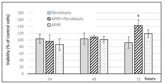 Effect of medium enriched with proteins released from A-PRF+ on fibroblast proliferation. T p < 0.05, significantly higher than all other groups. Data represent means ± SD from six different HGF donors.
