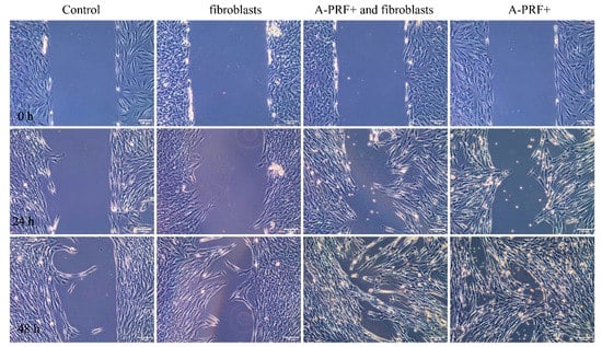 The in vitro wound healing assay for probing collective cell migration in two dimensions was performed using 2-well silicone inserts (Ibidi GmbH, Planegg, Germany) placed into a 6-well plate, which allowed the experimental variables to be standardized. To detect migration, 5 × 104 cells/well were suspended in a volume of 70 μL 10% FCS/DMEM. The cell culture inserts were removed after 24 h, leaving a defined cell-free gap of 500 µm. At this time point (0 h), the fresh medium was supplemented with medium enriched with culture fluid after a 3-day incubation with A-PRF+ alone, A-PRF+ and fibroblasts, fibroblasts alone, and DMEM alone, and then placed into each well, and images were taken.