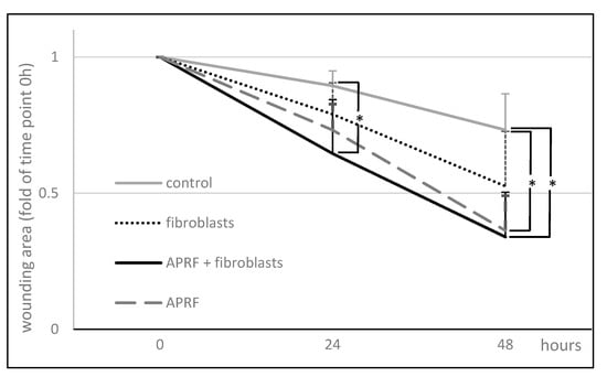 Compared to the wound area after 24 h of 11 ± 6% and 21 ± 12% for controls, which were incubated for three days either in medium alone or in medium with fibroblasts, respectively, the compounds released from A-PRF+ caused a moderate wound closure of 27 ± 10% for the factors released from A-RRF+ alone and, significantly, 35 ± 20% for the factors released from A-RRF+ combined with fibroblasts (p < 0.05; Figure 4). The degrees of wound closure after 48 h were significantly higher, i.e., 66 ± 16% and 64 ± 13% for the factors released from A-RRF+ alone and the factors released from A-RRF+ combined with fibroblasts, respectively, compared to 27 +/− 13% of the control wound area (p < 0.05; Figure 4).