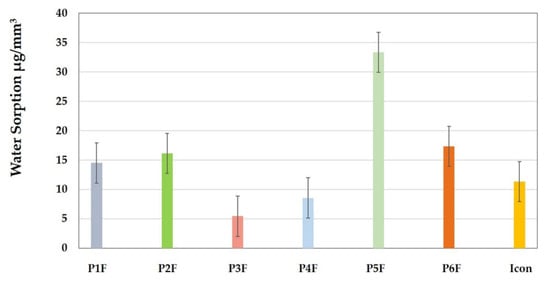 Statistically, it was concluded that there are significant differences between the groups analyzed for sorption (p = 9.00128 × 10−11). Following the Tukey absorption test, the differences between the values were evident; P5F was different to all other samples (P1F–P6F), whereas P3F, P4F, and P5F samples were statistically different from the P1F, P2F, and P6F samples. Icon showed not statistically different values compared to P1F and P4F.