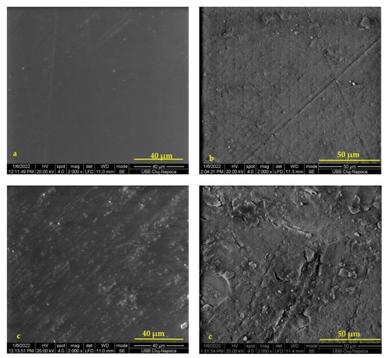 In both cases, after 7 days of immersion in water, obvious changes in the microstructure of the surfaces of the investigated samples were observed. There was a degradation of the sample surface, more accentuated in the case of the Icon sample, whose majority composition was represented by TEGDMA.