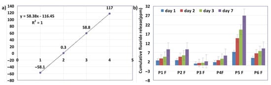 (a) The calibration curve of fluoride ions and (b) the cumulative fluoride release distribution over time for P1F–P6F experimental infiltrants.