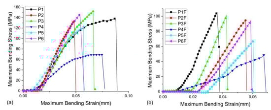 (a) Flexural strength of P1–P6 samples until fracture (b) Flexural strength of P1F–P6F samples until fracture.