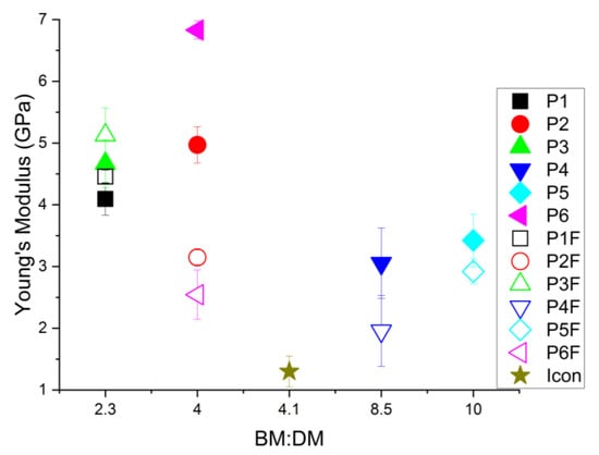 Graphical representation of Young’s modulus for experimental infiltrants (without/with filler in the resin mixture), as a function of the ratio between the base and the dilution monomer (BM:DM).