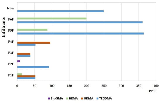 The classification of the total quantities of extracted residual monomer was as follows: P6F > P5F > Icon > P4F > P1F > P2F > P3F. The lowest value (75.4 ppm) was detected for the P3F infiltrant, and the highest value (560 ppm) was detected for the P6F infiltrant; residual TEGDMA (248 ppm) was detected for Icon.