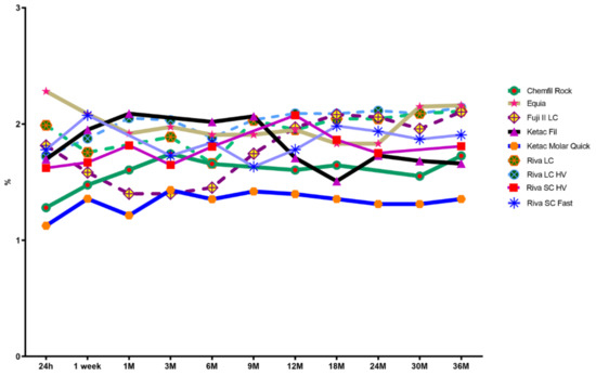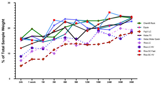 Water binding within glass ionomer materials has been described as a complex process [48] and assessment of bound water species content deserves additional consideration. When considered as a function of total sample weight, bound water content overall did not significantly increase for any material, with the collective maximum at 36 months noted as being approximately 2.1 percent or less of the total sample mass (Figure 4).
