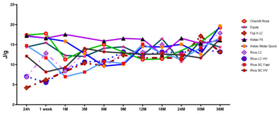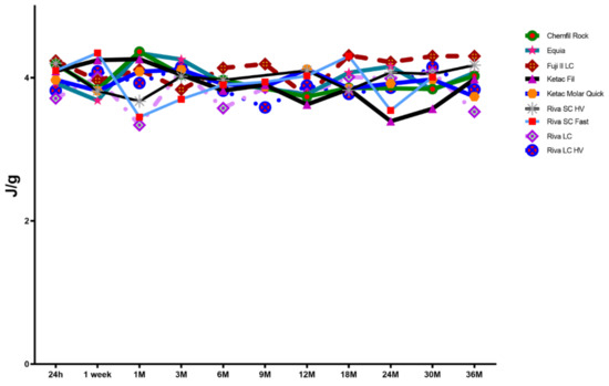 When bound water enthalpy is considered, Table 5 shows that there were no significant differences identified over the evaluation for all materials: Chemfil Rock (p = 0.36), Equia (p = 0.13), Ketac Fil (p = 0.35), Ketac Molar Quick (p = 0.78), Riva LC (p = 0.054), Riva LC HV (p = 0.39), Riva SC Fast (p = 0.98), and Riva SC HV (p = 0.24). When between material results were considered at each time interval, the results found that at each time period that there were no significant difference between the materials identified.