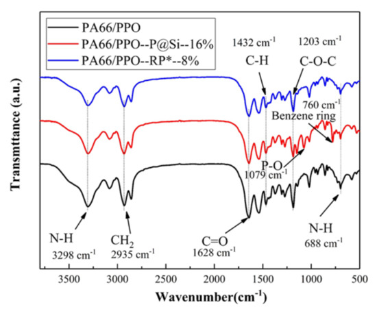 Figure 1 shows the FT-IR spectra of PA66/PPO composites. The typical absorption peaks of PA66 were found at 3298 cm−1 (N-H stretching), 2935 cm−1 (CH2 stretching), 1628 cm−1 (C = O stretching, amide I), and 688 cm−1 (N-H bending vibration) [28,29] in three samples. On the other hand, 1432 cm−1 (C-H stretching) and 1203 cm−1 (C-O-C stretching) [30,31] were the typical absorption peaks of PPO. PA66 and PPO possessed good compatibility under the action of the HIPS-g-MAH compatibilizer [17]. In addition, the stretching vibration absorption peaks of P-O and the benzene ring of aluminum diethylphosphinate (ADP) appeared at 1079 cm−1 and 760 cm−1 [32] in the PA66/PPO–P@Si–16% composites, meaning that flame-retardant P@Si was detected. However, the typical absorption peaks of RP* were not found in the PA66/PPO–RP*–8% composites. It is possible that the red phosphorus was wholly coated by Al(OH)3. No chemical reactions occurred because the P@Si and RP* flame retardants are of the additive type rather than the reactive type.
