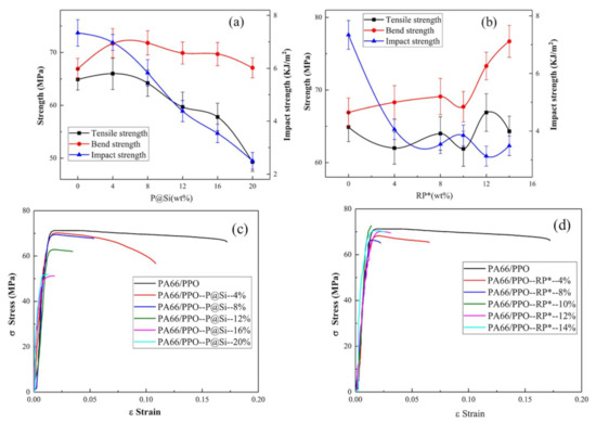 Mechanical properties of (a) PA66/PPO–P@Si and (b) PA66/PPO–RP* composites, and stress-strain curves of (c) PA66/PPO–P@Si and (d) PA66/PPO–RP* composites.