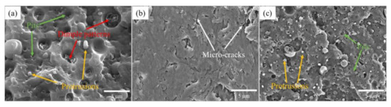 Figure 4 shows the SEM images of the notch impact surfaces of different samples. Many protrusions (orange arrows), pits (green arrows), and dimple patterns (red arrows) were found on the surface of the PA66/PPO compositions, indicating that the impact fracture was a ductile fracture, as shown in Figure 4a. However, in Figure 4b, the impact fracture morphologies of PA66/PPO–P@Si–16% showed a relatively smooth surface and some micro-cracks (white arrows) were found in the SEM image, showing a brittle fracture mode, rather than the ductile fracture mode. The results corresponded to the reduction of impact strength, as shown in Figure 3a. Furthermore, although some smaller protrusions and pits were found on the surface in Figure 4c, the dimple patterns disappeared on the surface, indicating that the impact fracture mode of the PA66/PPO–RP*–8% composite was not the ductile fracture mode. As a result, the impact strength of PA66/PPO–RP* composites decreased, as shown in Figure 3b.