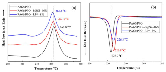 Figure 5 shows the DSC curves of the PA66/PPO composites. Endo and Exo stand for endothermic and exothermic heat. In Figure 5a, the melting peaks of PA66/PPO composites PA66/PPO–P@Si–16% and PA66/PPO–RP*–8% appeared at 263.0 °C, 262.3 °C, and 261.6 °C, respectively. The addition of flame retardant did not increase the melting temperature of PA66/PPO compositions but slightly lowered the melting temperature of PA66/PPO composites. The reduction of the melting temperature of PA66/PPO–P@Si–16% and PA66/PPO–RP*–8% composites was attributed to the decrease in the crystallinity of the composite material under the action of the flame retardant. Figure 5b shows the DSC curves of PA66/PPO composites during the cooling process. The cold crystallization peaks of the PA66/PPO PA66/PPO–P@Si and PA66/PPO–RP* composites were observed at 223.7 °C, 226.8 °C, and 226.3 °C, respectively. The addition of flame retardant increased the temperature of the cold crystallization peak. The cold crystallization peak of the PA66/PPO composites was relatively sharp, meaning that the crystal formation and growth rate of the PA66/PPO composites was fast after reaching a sufficient degree of subcooling. The introduction of flame retardant limited the migration and rearrangement of the molecular chains of PA66/PPO composites, reduced the rate of crystal formation and growth, causing the grain size distribution to be uneven and meaning that the degree of crystallinity was not perfect.