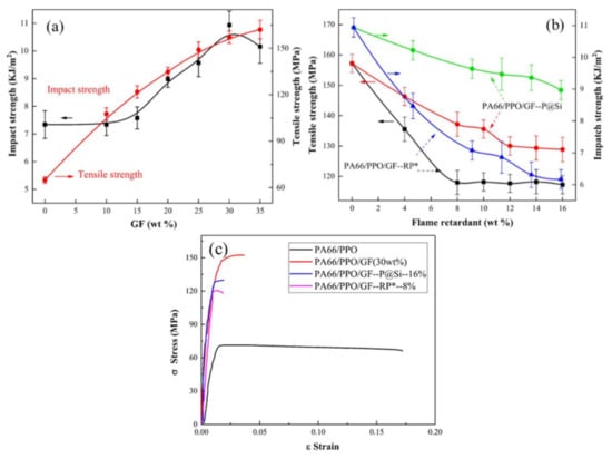 Mechanical properties of the (a) PA66/PPO/GF and (b) PA66/PPO/GF composites, and the corresponding stress-strain curves (c).