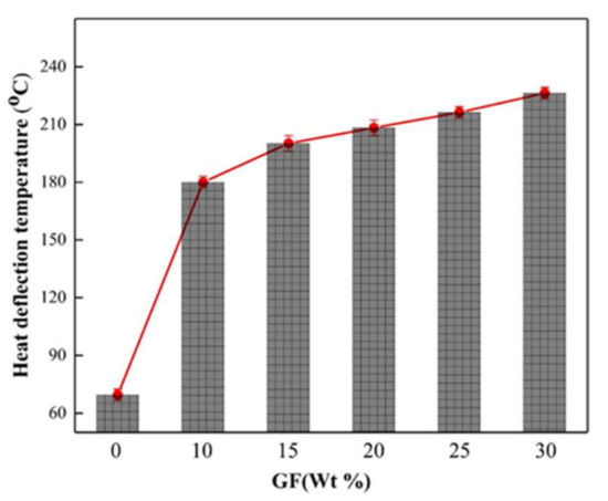 Figure 7 shows the thermal deformation temperature (HDT) of PA66-PPO composites with different GF ratios. The HDT of PA66 was approximate 50 °C, based on [34]. The HDT of GF-free PA66-PPO composites was approximately 72 °C and this was higher due to the higher glass transformation temperature of PPO [35]. The HDT of PA66-PPO containing GF continuously increased with increasing GF contents, meaning that the GF improved the heat properties of PA66/PPO composites. The HDT of PA66-PPO composite reached 225 °C, showing an improvement of 200%, when the GF content was 30 wt%. This phenomenon indicates that GF remarkably improved the HDT property.