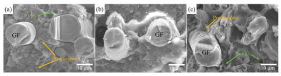 SEM images of the notch impact surfaces of the PA66/PPO/GF composites (a) PA66/PPO/GF, (b) PA66/PPO/GF–P@Si–16%, and (c) PA66/PPO/GF–RP*–8%.