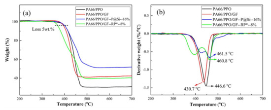 The influence of the GF, P@Si, and RP* flame retardants on the decomposition of the PA66/PPO, PA66/PPO, PA66/PPO/GF, PA66/PPO/GF–P@Si–16%, and PA66/PPO/GF–RP*–8% composites were characterized. All samples were heated in a nitrogen (N2) atmosphere from room temperature to 800 °C. The corresponding TAG and DTG curves of the PA66/PPO, PA66/PPO/GF, PA66/PPO/GF–P@Si–16%, and PA66/PPO/GF–RP*–8% composites are shown in Figure 9. Due to the “wick effect” of GF [36,37], the thermal stability, such as the initial decomposition temperature (Tloss 5 wt%), the maximum mass loss rate (Rmax), and the maximum mass loss rate temperature (Tmax), of the PA66/PPO/GF composites were all reduced compared to the PA66/PPO composites. The detailed data are listed in Table 3.