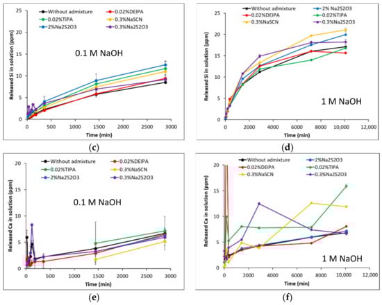 | Glass | NaOH Concentration | Parameter | Without Admixture | 0.02% DEIPA | 0.02% TIPA | 0.3% NaSCN | 0.3% Na2S2O3 | 2% Na2S2O3 |