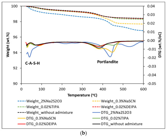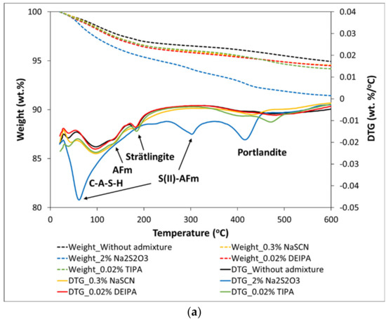 - Lothenbach, B.; Durdziński, P.T.; De Weerdt, K. Chapter 5. Thermogravimetric analysis. In A Practical Guide to Microstructural Analysis of Cementitious Materials; Scrivener, K., Snellings, R., Lothenbach, B., Eds.; CRC Press: Boca Raton, FL, USA, 2016. [Google Scholar] [CrossRef]