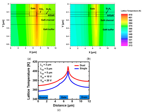 Cross-section of lattice temperature distribution in recessed-gate GaN MOSFET using (a) the stacked TiO2/Si3N4 dual-layer insulator, (b) Si3N4 single-layer insulator and (c) lattice temperature distribution according to AlGaN/GaN interface and channel layer for (a,b) when self-heating effect is applied at VDS = 20 V, VGS = 10 V.