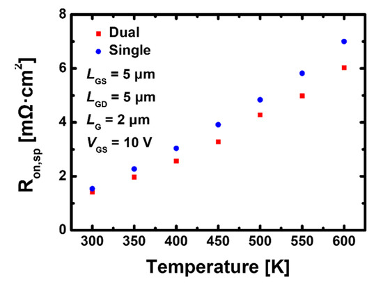 Figure 7 shows the specific on resistance value extracted from the ID-VD transfer curve when the lattice temperature is increased from 300 K to 600 K to examine the change trend of electrical characteristics under the same lattice temperature. The self-heating model produces temperature dispersion, but in this experiment, the temperature in all regions was set to be the constant. The resistance is calculated from the following equation: