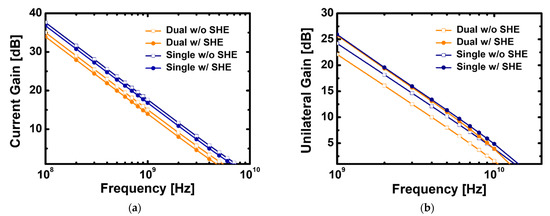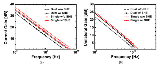 Figure 9a,b shows the current and unilateral gains based on frequency increase in the recessed-gate GaN MOSFET with the stacked TiO2/Si3N4 dual- and Si3N4 single-layer insulators, where cut-off frequency (fT) and maximum oscillation frequency (fmax) values were extracted at high frequency with and without SHE. The RF characteristics analysis is possible using the equation derived from the Y-parameter, and the equation is as follows: