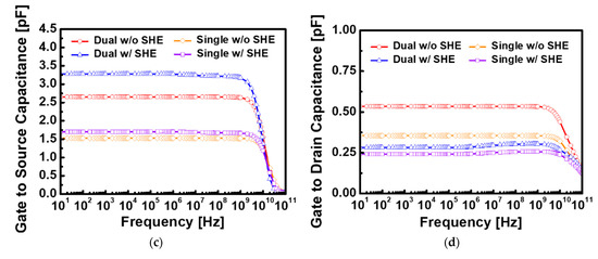 Because VD and VG are changed by AC signals, unlike in DC signals, which affect the charge of the channel and gate, the Cgd and Cgs should be separately analyzed; thus, the semiconductor oxide capacitance value can no longer be defined as only Cox. Figure 9c,d shows Cgd and Cgs in the frequency range of 10–1011 Hz for the four cases in Figure 9a,b, where Cgs is dominant in determining the oxide capacitance value. The Cgs is larger for devices with SHE than those without SHE, which is due to a decrease in the thermally activated carriers’ detrapping phenomena in the donor layer, resulting in a decrease in the equivalent doping level; thus, smaller Cgs is observed at lower temperatures [34]. We confirm from this capacitance analysis that the Cgs of devices with a stacked TiO2/Si3N4 dual-layer insulator is large, as gm has a significantly large value, whereas the gm of devices with a Si3N4 single-layer insulator is relatively small. However, higher frequency operations in terms of RF characteristics are possible since Cgs is extremely small. The fmax to which the SHE is applied has a larger value than that to which the SHE is not applied in the two types of devices, unlike Figure 9a. Table 2 shows that the values of Cgs and Cgd are reversed based on whether SHE is applied because the value of the VG in the section where gm is the maximum decreases as the temperature increase; therefore, the capacitance value is estimated to be small when that value is applied during AC simulation, which affects these results. However, it is unchanged that the maximum frequency value is larger when GaN MOSFET is used as a Si3N4 single-layer insulator.