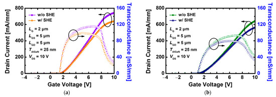 Figure 6a,b shows the ID-drain voltage (VD) transfer curves for two types of devices with and without SHE. In the saturation region, as the slope of the curve decreases and the current tends to be constant, when SHE is not applied, whereas the saturation current is degraded when SHE is applied [32]. This phenomenon is because the increasing electric field and current density contribute to heat generation, and as thermal scattering is accelerated, electron mobility is reduced. When VGS = 10 V, ID, max is 883.05 mA/mm for GaN MOSFET with the stacked TiO2/Si3N4 dual-layer insulator without SHE, and the ID decreases to 536.20 mA/mm when the heat is generated. Furthermore, ID, max of GaN MOSFET with a Si3N4 single-layer insulator is 727.71 and 463.98 mA/mm with and without SHE, respectively, and it is confirmed that the electrical performance is lowered by SHE. The lattice has a relatively larger peak temperature value when the stacked TiO2/Si3N4 dual-layer insulator is used; however, it still has a higher ID despite severe thermal scattering because the current density is significantly higher in an environment with a constant heat of 300 K. This implies that if the characteristics of both devices are analyzed at the same temperature, additional benefits in terms of current can be obtained when the dual-layer insulator is used.
