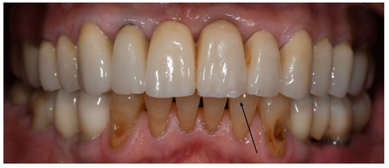 With regard to biological complications, the only complications that exhibited a borderline, although not significant, difference were three fractured teeth exclusively in the bruxer group (p = 0.051). The fractured teeth were in two different patients; one patient with two vital fractured premolars (first tooth after one year of function, the second after four years, Figure 1), and one patient with a non-vital fractured canine (after five years of function). Both patients did not wear an occlusal guard.
