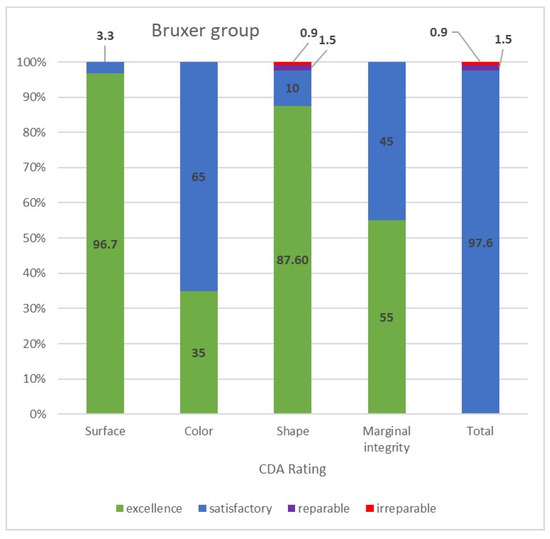The CDA ratings were divided into those of the bruxer (Figure 3) and the non-bruxer (Figure 4) groups. The bruxer group had 96.7% excellent and 3.3% satisfactory surfaces (due to porcelain chipping and zirconia fracture); 35% excellent color; 87.6% excellent shape (due to three irreparable fractured teeth [0.9%] and five reparable open proximal contacts [1.5%] with another 10%, including the six open proximal contacts without food impaction, were evaluated as having a satisfactory shape); 45% marginal integrity rated as satisfactory (due to over contouring or open margins that led to two cases of secondary caries). The non-bruxer group comprised 98.4% excellent and 1.6% satisfactory surfaces (due to porcelain chipping and zirconia fracture); 45% excellent color; 90.2% excellent shape (due to seven reparable open proximal contacts [2.3%] with another 7.5%, including the six open proximal contacts, without food impaction, evaluated as having a satisfactory shape); and 40% marginal integrity rated as satisfactory (due to over contouring or open margins that led to three cases of secondary caries). Overall, 97.6% and 97.7% of restorations in the bruxer and the non-bruxer groups, respectively, were evaluated as satisfactory and not in need of repair or remake.