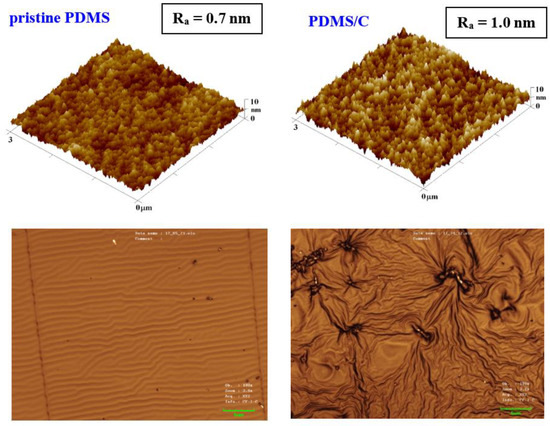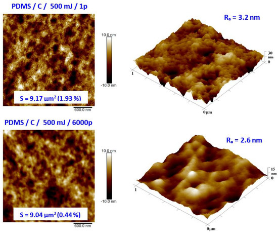 As the second major surface activation, we examined in detail the surface physicochemical changes induced on the PDMS surface by a high-energy excimer laser. We aimed at both surface morphology and surface chemistry changes. Pristine PDMS and PDMS-C nanocomposite morphology and the influence of high-energy excimer exposure were examined in detail. The surface morphology of a high-energy excimer laser is shown in Figure 6. We chose the particular samples treated only with one shot of 500 mJ and compared it with treatment with the same laser energy but several pulses (6000). As it is obvious from AFM analysis, the PDMS surface morphology was altered. As it is obvious from Figure 6, the laser treatment leads to more pronounced surface ablation, which is accompanied by a diminishing PDMS surface nanopattern and a slight decrease in surface roughness. The higher was the number of laser pulses, the larger changes on the PDMS surface were observed (Figure 6).