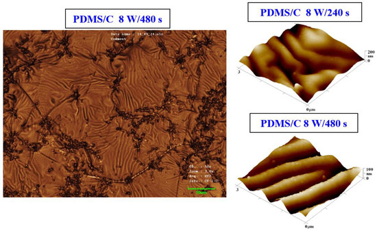 We present an analysis of a heat-treated and plasma-treated PDMS foil with an exposure power of 8 W and 240 s, which exhibited the most pronounced surface changes. As it is obvious from Figure 2, the simple technique of heat treatment had a significant effect on the formation of a wrinkle-like pattern. The higher was the plasma power applied, the more pronounced the wrinkle-like pattern was created, which was confirmed both by AFM and LCM analyses (see Figure 2). The appearance of a wrinkle-like pattern is connected to the formation of a polymer bilayer, one with an increase in the amount of the crystalline phase (as the amorphous phase is revealed by plasma ablation), the effect previously described for PLLA-metal bilayers, heated plasma-treated PLLA, or PLLA–carbon composites [40].