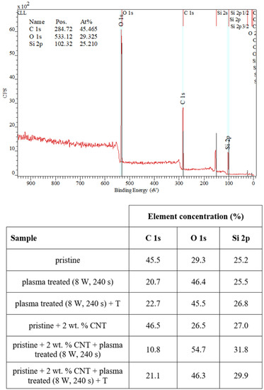 We also examined the surface chemistry so that we can support our conclusions regarding surface changes of plasma-treated or heated samples. Figure 5 shows a spectrum of pristine PDMS and corresponding changes in surface chemistry. In Figure 5, it is evident that the simple addition of CNTs into the PDMS matrix-induced only slight changes in carbon concentration (an increase) and surface oxygen concentration (a decrease by approximately 1 at.% of carbon). The major effect of surface chemistry changes was observed after plasma treatment. The major increase in surface oxygen concentration was observed for both pristine and PDMS-C samples, which were treated with argon plasma. The PDMS samples showed an even higher increase in oxygen concentration after plasma exposure at 8 W and 240 s, and the concentration increased above 50 at.%. Heat treatment usually induces a decrease in oxygen concentration and a major increase in CA, which was observed, for example, for polymethyl pentene [41]. In Figure 5, we can see that the subsequent heat treatment induced only a mild decrease in oxygen concentration, and even stabilized samples had a significantly large oxygen concentration compared with nontreated samples.