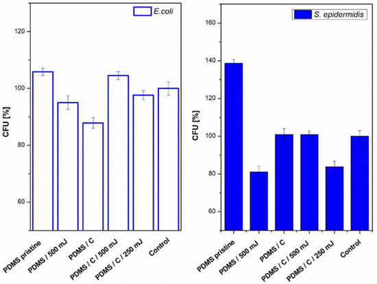 Next, we also determined the antibacterial properties of both pristine PDMS and PDMS–carbon composites together with the effect of a high-energy excimer laser. The antibacterial activity of the samples was evaluated against two bacterial strains of S. epidermidis (Gram-positive bacteria) and E. coli (Gram-negative bacteria). As it is obvious from Figure 8, the highest antibacterial effect was achieved against S. epidermidis on pristine PDMS treated with an energy of 500 mJ and PDMS-C nanocomposite treated with a lower energy of 250 mJ. Additionally, for 500 mJ treatment, a considerable decrease in the number of colony-forming units (CFU) was detected. In the case of E. coli, the strongest antibacterial effect was determined only for a simple PDMS-C composite without additional laser activation.