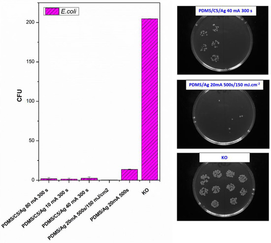 Antibacterial activity of polydimethylsiloxane (PDMS) samples (Goodfellow) against bacterial strain E. coli after 4 h incubation. Samples: PDMS coated with carbon and subsequently different thickness of Ag (PDMS/C5/Ag 80 mA 300 s; PDMS/C5/Ag 10 mA 300 s; PDMS/C5/Ag 40 mA 300 s), PDMS coated with carbon, and Ag and subsequently treated with high-energy laser (PDMS/Ag 20 mA 500 s/150 mJ·cm−2), PDMS coated only with Ag (PDMS/Ag 20 mA 500 s and control (bacteria in physiological solution)). Representative photos of CFUs on selected samples are introduced on the right side of the figure. CFU represents colony-forming units grown on agar plates.