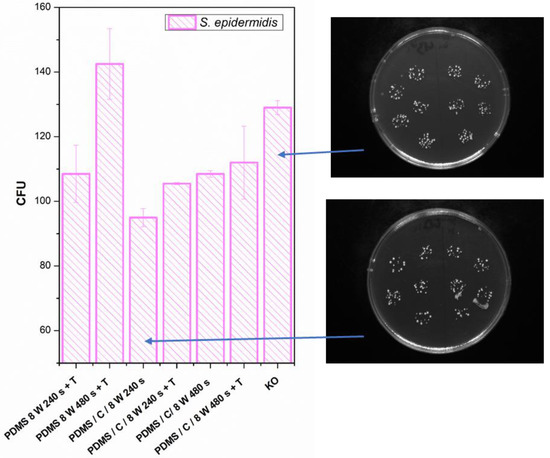 Antibacterial activity of polydimethylsiloxane (PDMS) samples against bacterial strains of S. epidermidis after 4 h incubation. Samples: plasma-treated PDMS with 8 W for 240 and 480 s with subsequent heat treatment (PDMS 8 W 240 s + T; PDMS 8 W 240 s + T); PDMS composite with carbon (2 wt.%) treated with plasma 8 W for 240 s (PDMS/C/8W 240s) and the same sample subsequently heat-treated (PDMS/C/8W 240s + T); PDMS composite with carbon (2 wt.%) treated with plasma 8 W for 480 s (PDMS/C/8W 480s) and the same sample subsequently heat-treated (PDMS/C/8W 480s + T); and control (bacteria in physiological solution). CFU represents colony-forming units grown on agar plates. Selected photos of samples are also introduced.