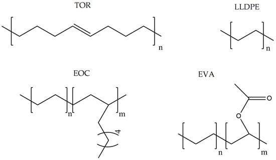 Table 2 summarizes the values of MFR/MVR, Mooney viscosity, and RPA measurements for the studied samples. The first two (MFR/MVR and Mooney viscosity) can be taken as standardized tests showing the potential of the flow behavior of blends, considering the fact that the different linearity and structure of thermoplastics (see Table 1 and Figure 1) can play a key role in the processing and properties of the resulting blends. RPA gives a very unique signature of dynamic processing and fluidity of the highly viscous systems, to be used in the analysis of real-scale processing of GTR-rich blends. Two compositions of GTR/thermoplastic blends, namely 50/50 and 75/25 wt.% could also reflect the processability and possibility of maximal loading of GTR. In terms of the measurements, the Mooney viscosity, MFR/MVR, and RPA tests conducted on the blend samples were performed at 100 °C and 190 °C, respectively, such that GTR blends with thermoplastics could be compared from a processability point of view with neat rubbers/thermoplastic elastomers (Mooney viscosity) and thermoplastics/thermoplastic elastomers (MFR/MVR). The values of Mooney viscosity measured at 100 °C for 50/50 blends of GTR/TOR and GTR/EVA were 11.7 and 42.8, respectively. On the other hand, for 50/50 GTR/EOC and GTR/LLDPE blends, no data was collected. Since Mooney viscosity reflects the resistance of an uncured rubber compound [], the application of this method for partially cross-linked polymers or polymeric materials filled with GTR might be limited. The results showed that the presence of thermoplastics with softening and melting temperatures close to 100 °C (EOC, LLDPE) affects the rubber-like character and elasticity of modified GTR, which resulted in overloading of the torque during Mooney viscosity measurements.