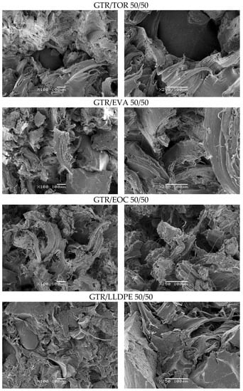 For 50/50 GTR/LLDPE, a very low value of elongation of 41% can be simply corroborated considering the fragile surface of the sample observed in Figure 4. Values of 293 and 329% for elongation at break of 50/50 GTR/TOC and GTR/EVA blends are also in agreement with the shape of deformed particles at the fracture surfaces in the stress-strain curves presented in Figure 3. The images on the right in Figure 4 and Figure 5 provide a closer view of the interaction state in the fractured surfaces.