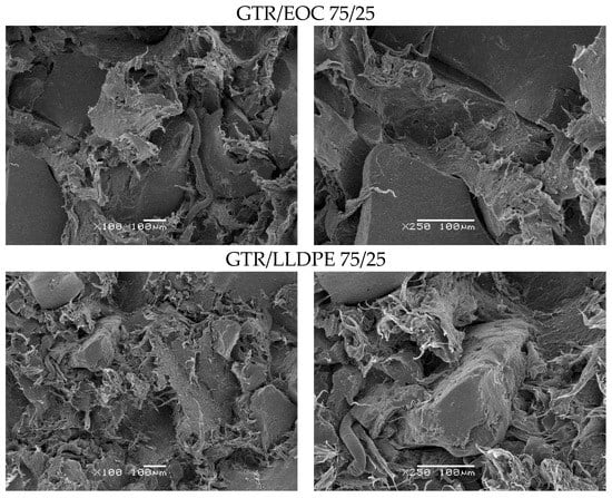 As presented in Figure 5, for 75/25 wt.% GTR/thermoplastics blends, a more uniform morphology was observed for all of them. Compared to 50/50 systems, a more fibrillar fracture surface can be observed in 75/25 blends, which is characteristic of rubber-like behavior. For GTR/TOR system, a uniform fracture surface can be seen (Figure 4), which is in accordance with a very high elongation at break of 440% obtained for this sample (Table 4). The GTR/EVA 75/25 system also shows a uniform fracture surface with ductile fracture, ascribed to 436% breakup elongation. For 50/50 blends, the dispersion of reclaimed rubber within LLDPE and the tensile strength of the order of results of this survey have already been reported []. Moreover, it should be highlighted that blends based on a rubber-like polyolefin to some extent made the interface strong, leading to more uniformity and dispersion as a result of the formation of the core-shell droplets with thermoplastics and GTR as core-forming components in a relatively complex system, which was described by Li et al. []. The authors also noticed that polarity plays a key role in achieving appropriate adhesion between phases. The results demonstrated that the addition of non-polar EOC to a high-density polyethylene/ground tire rubber blend enhances encapsulation of GTR by EOC phase, while for polar EVA, phase separation between GTR and EVA was observed, which determines mechanical strength []. However, in the presented example, the impact of elastomer polarity on its compatibility and interfacial adhesion with high-density polyethylene should be also considered.