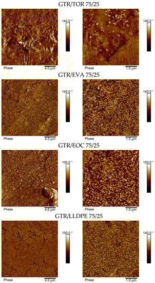 Moreover, AFM phase images showed that, in the case of GTR/thermoplastic blends with a ratio of 75/25 wt.%, the used thermoplastics are embedded in the GTR-rich phase, which is especially visible for GTR/thermoplastic blends with EVA, EOC, and LLPPE. As in the case of GTR/thermoplastic blends with a ratio of 50/50 wt.%, the investigated ultramicrotomy cut surface is smooth, without gaps between the blend components (roughness of the surface calculated from the AFM height images (20 × 20 μm) was equal to 370 nm, 390 nm, 240 nm, and 93 nm for GTR/thermoplastic blends with TOR, EVA, EOC, and LLPPE, respectively). It can be seen that the largest value is about four times the smallest one dedicated to the GTR/LLDPE system. Such a difference was, however, around 2.5 times for 50/50 wt.% blends, a characteristic of the dominance of the GTR role. This is also in good agreement with the mechanical properties of 75/25 blends with similar tensile strength, except for the GTR/LLDPE blend (see Figure 3).
