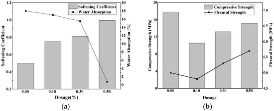 Influence of different hydrophobic agent dosages on the phosphogypsum at 7d. (a) Softening coefficient and water absorption rate; (b) Compressive strength and flexural strength.