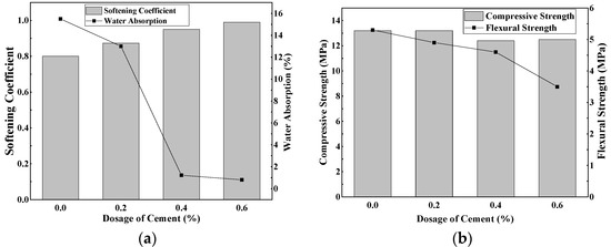 Influence of different cement contents on the phosphogypsum with a hydrophobic agent. (a) Softening coefficient and water absorption. (b) Compressive strength and flexural strength.