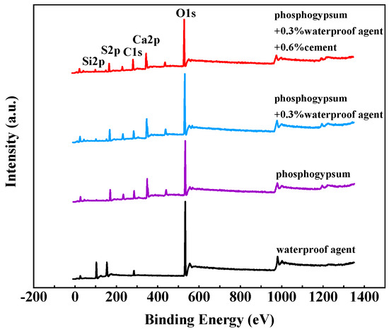 To further explore the influence mechanism of the dosages of the silicone hydrophobic agent and the weight ratios of cement on the water resistance performance of the phosphogypsum system, XPS was carried out by selecting four mixture ratios: the original solution of the hydrophobic agent, the reference group of phosphogypsum, phosphogypsum +0.3% hydrophobic agent, and phosphogypsum +0.3% hydrophobic agent +0.6% cement. Figure 5 shows the total XPS spectrum of the elements in the gypsum samples, and the content of each element is shown in Table 5.