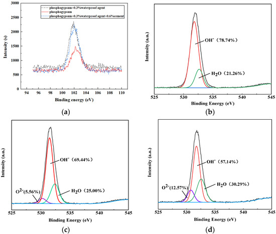 In the XPS results, the changes in Si 2p and the peak fitting of O 1s in the phosphogypsum, phosphogypsum +0.3 wt.% hydrophobic agent, phosphogypsum +0.3 wt.% hydrophobic agent and phosphogypsum +0.3 wt.% hydrophobic agent +0.6 wt.% cement are shown in Figure 6. Figure 6a shows that the addition of the hydrophobic agent significantly increased the relative content of silicon in gypsum compared with that of the phosphogypsum reference group. This was because the hydrophobic agent used was an organosilicon hydrophobic agent, and silicon was its main element. The addition of an organosilicon hydrophobic agent to the surface of gypsum crystals increased the content of Si in gypsum. The addition of the hydrophobic agent shifted the peak position of the silicon peak in the gypsum to lower binding energy, indicating that a chemical reaction occurred between the silicone hydrophobic agent and the gypsum, changing the binding state of silicon within the XPS spectrum of the phosphogypsum +0.3 wt.% hydrophobic agent +0.6 wt.% cement or the phosphogypsum +0.3 wt.% hydrophobic agent. The relative content of Si 2p was higher, and the peak position shift was more obvious, indicating that the appropriate alkalinity enhanced the chemical reaction between the hydrophobic agent and gypsum [19].