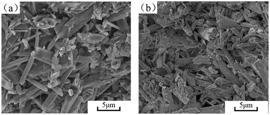 When the cement content was 0.6 wt.%, gypsum had the best water-resistance performance. In this situation, the softening coefficient was 0.99, the water absorption rate was 0.8%, and the pH of the slurry was 7–8. Figure 3b showed that the increase in cement admixture lowered the mechanical properties of the gypsum block; namely, the compressive strength and flexural strength further decreased because the cement promoted the hydrolysis of the organosilicon hydrophobic agent and the polymerization reaction of the gypsum crystals. More organic silicon hydrophobic agent was added to the surface of the gypsum slurry, inhibiting the gypsum hydration reaction and interfering with the gypsum crystal structure, leading to a decrease in the strength of the gypsum block [18].