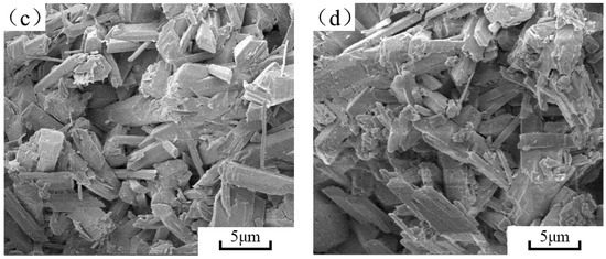 The hydration product of phosphogypsum was calcium sulfate dihydrate. As Figure 7a shows, the calcium sulfate dihydrate in the reference group was long, columnar, and randomly distributed in the matrix. They overlap with each other to provide strength for the hardened material. Figure 7b shows that the addition of the hydrophobic agent had no obvious effect on the morphology of the calcium sulfate hydrate, and the hydration products in the matrix also did not change. Meanwhile, the hydrophobic agent formed a lamellar layer that adhered to the surface of crystals to improve their waterproofing. The alkalinity of the gypsum system with a 0.3% hydrophobic agent was adjusted by cement; the addition of cement did not change the main hydration product composition of the matrix, and the calcium sulfate dihydrate crystal retained its original shape. Crystals with poor crystallinity were observed as the addition of cement increase the pH of the system [22]. The aluminate phase in the cement reacted with the phosphogypsum to form needle-like ettringite, thereby leading to a lower strength. The amount of cement increased, the calcium sulfate dihydrate coarsened because the cement promoted the hydrolysis and polymerization reactions of the hydrophobic agent, according to the results of the XPS spectrum. The hydrophobic agent adsorbed onto the surface of gypsum crystals and made the crystals denser. This prevents the water from flowing and migrating into the gypsum, thereby reducing the water absorption.