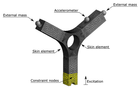 To better replicate such test conditions, an additional element mass, namely “Accelerometer” in Figure 1, has been applied to the point where the accelerometer will be placed in the experimental tests. The imposed mass of the accelerometer is supplied by the manufacturer and it is equal to 0.2 g. The mass is place at a distance equal to 1.4 mm in the normal direction to the surface corresponding to the position of the accelerometer center of gravity indicated in the datasheet.