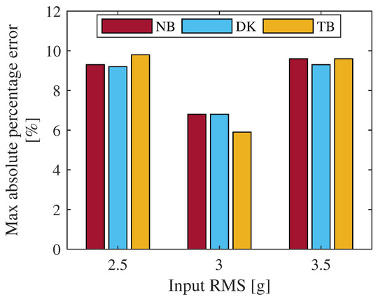As visible from Table 4, the numerical computed fatigue life are in perfect agreement with those experimentally obtained. Indeed, the absolute percentage error shown in Table 4, is always lower than 10%, thus indicating a good correlation between data. To graphically compare the maximum error, Figure 11 shows a comparison, in terms of maximum percentage error of computed fatigue life, between all three adopted spectral methods for fatigue life estimation for each excitation considered in this activity.